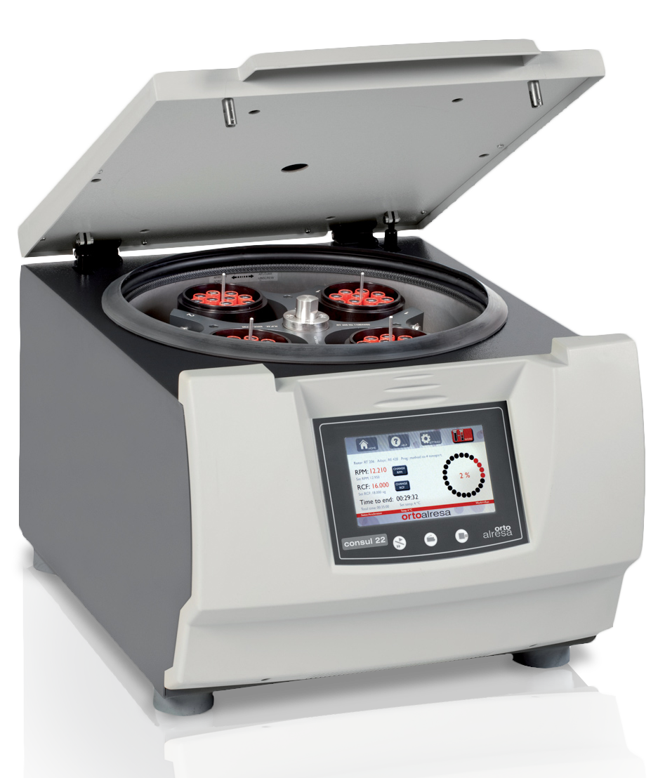 The Consul 22 benchtop ventilated centrifuge by Ortoalresa delivers high-speed, precise separation up to 14,300 RPM / 21,948 × g in a compact footprint, with 4 × 400 mL capacity, multiple rotor options, and an intuitive touchscreen for reproducible results.